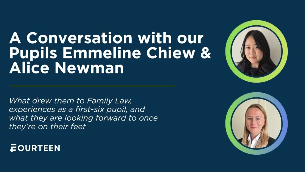 At FOURTEEN our current pupils, Emmeline Chiew & Alice Newman, are approaching the end of their first six and the transition to being on their feet in April; a pivotal stage in any barrister’s career. In this conversation, they look back on what drew them to family law, how they chose FOURTEEN, and how those expectations have measured up in practice.